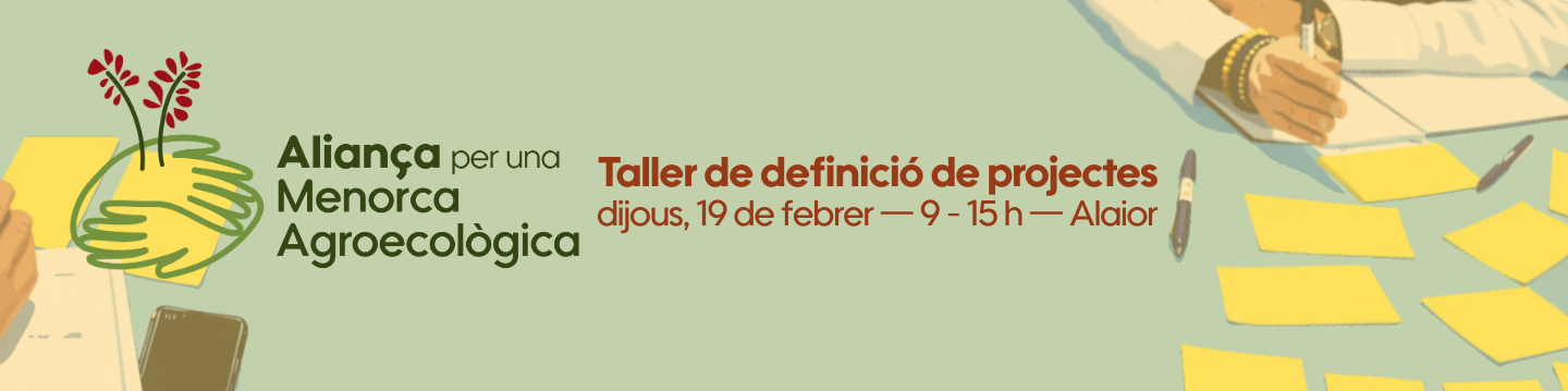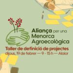 L’Aliança per una Menorca Agroecològica convoca un Taller de Definició de Projectes el pròxim dijous, 19 de febrer, a CentreBit Menorca (Av. des Camp Verd, 4, a Alaior), amb la voluntat de reforçar i ampliar el procés participatiu iniciat fa un any. La jornada s’adreça a totes les persones i entitats que vulguin implicar-se en la transformació del sector agrari menorquí cap a un model més sostenible, just i estretament vinculat al territori.