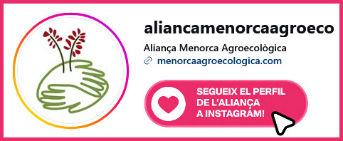 L’Aliança per una Menorca Agroecològica està formada per entitats que comparteixen el compromís de fer evolucionar el sector agrari de l’illa des d’una perspectiva ambientalment responsable, econòmicament viable i socialment justa. Davant la dimensió del repte que suposa transformar un sector productiu sencer, l’Aliança aposta decididament per reforçar el treball conjunt i per obrir el projecte a totes aquelles persones i col·lectius interessats en el futur del camp menorquí. Ara és el moment de sumar-s’hi i participar activament en aquest procés col·lectiu!
